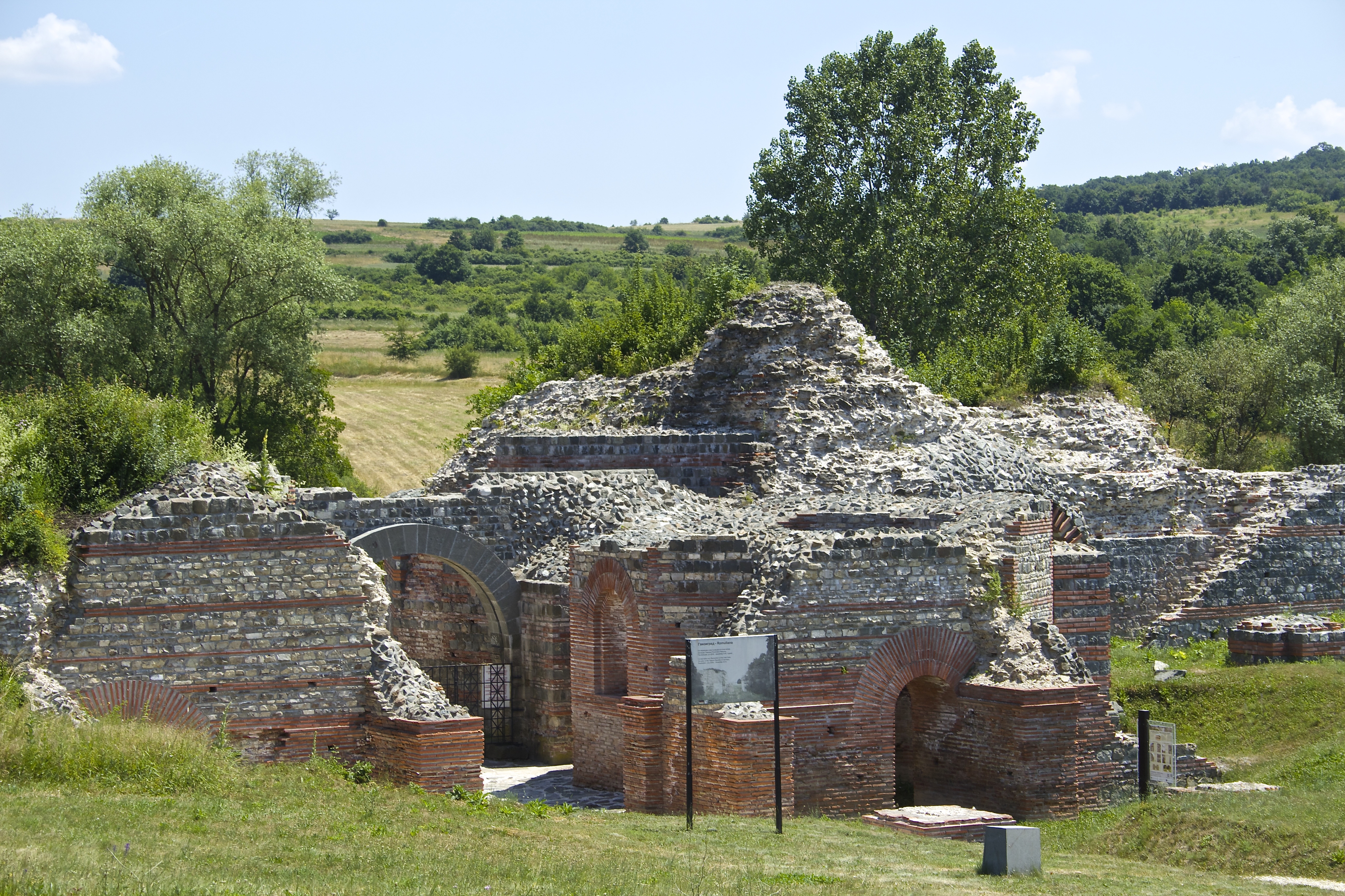 My route unintentionally paralleled the Danube wine tour, which also reflects the Roman investment in protecting this northern bulwark of the late Eastern Roman Empire. I took a side trip to the gigantic 3rd & 4th century fortress, temple and palace complex, Felix Romuliana, named for the Emperor Galerius’ mother, Romula. A UNESCO World Heritage site since 2007, it is well maintained, if rather crudely presented, and appears to have some of the most significant standing walls remaining from the period. But a sign crediting the German government with helping fund the ‘stabilisation and reconstruction’ of the eastern gatehouse (below) suggests quite a bit of re-building has been going on, an approach to conservation some of us disapprove of. (Mind you, I forgot to mention that the Mozarts’ Wohnhaus in Salzburg was largely a rebuild, thanks to the Allies having bombed it to smithereens in 1944.)