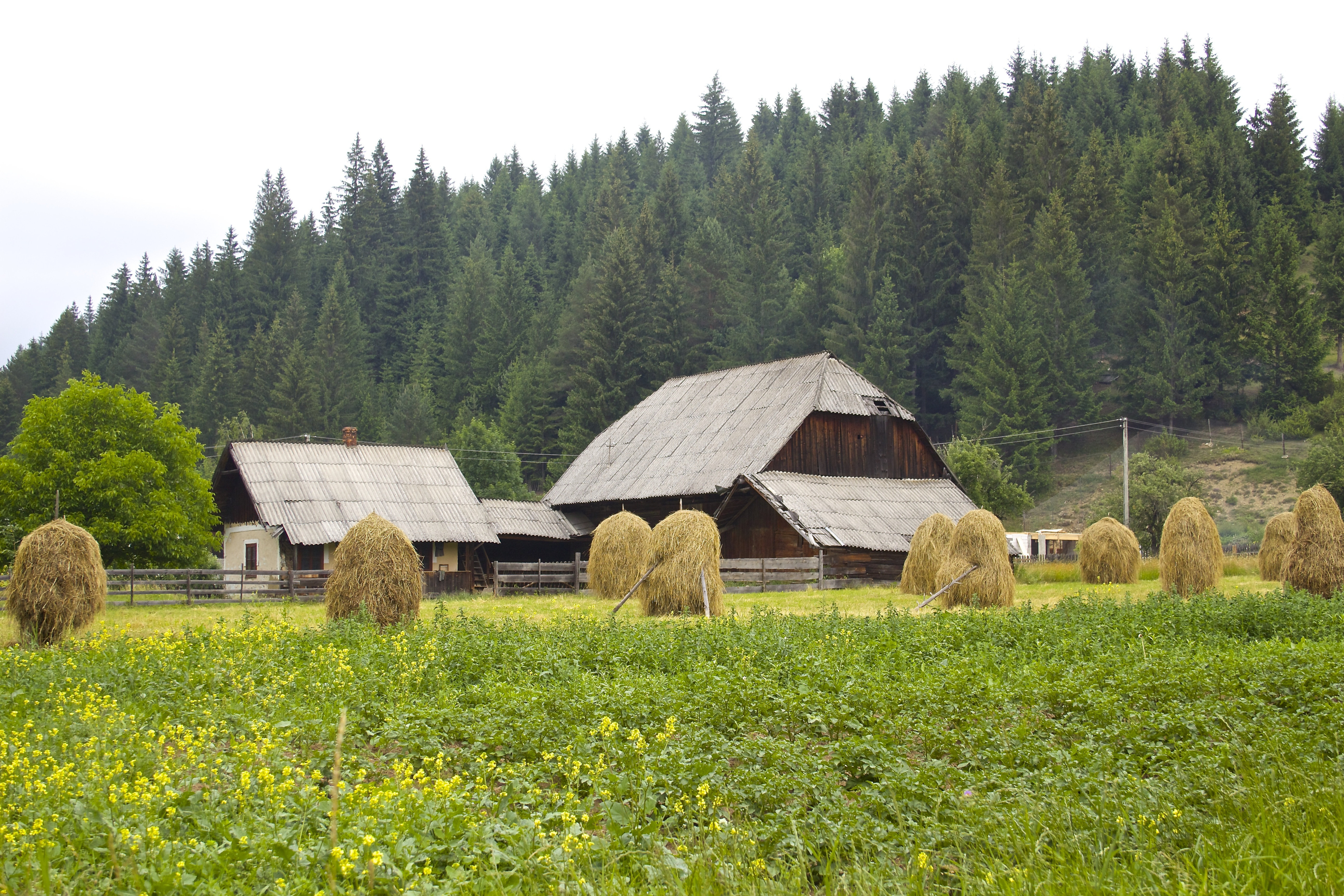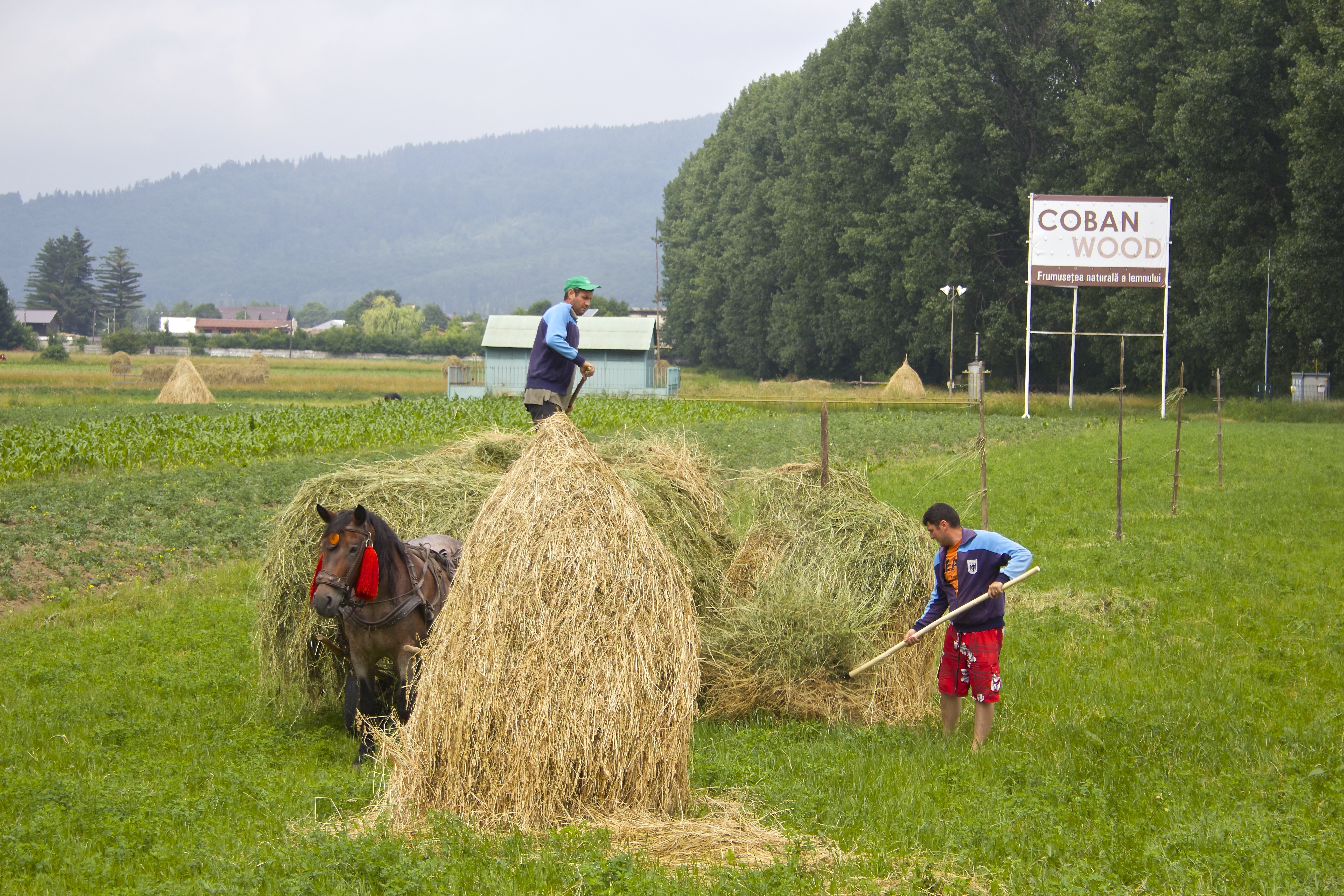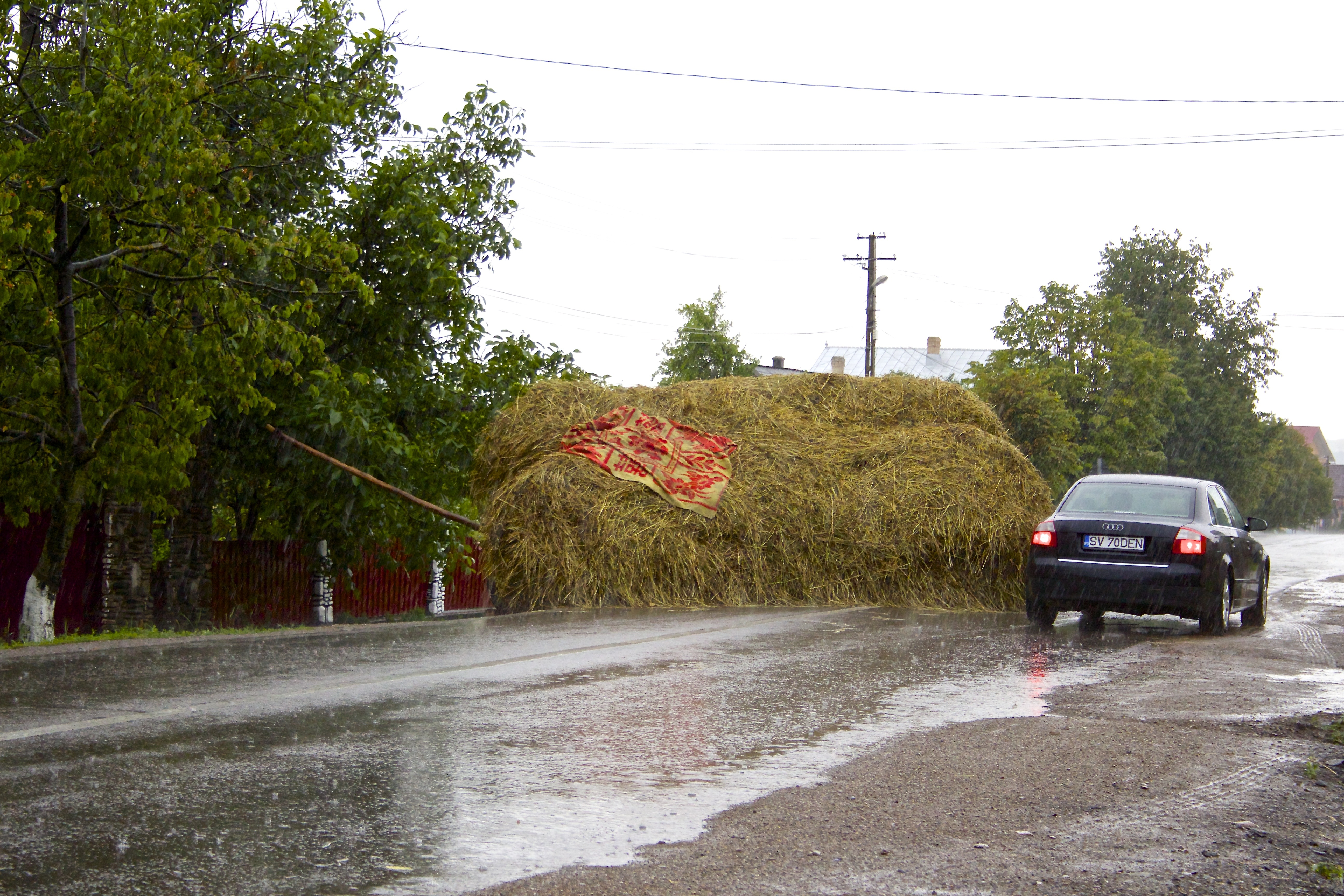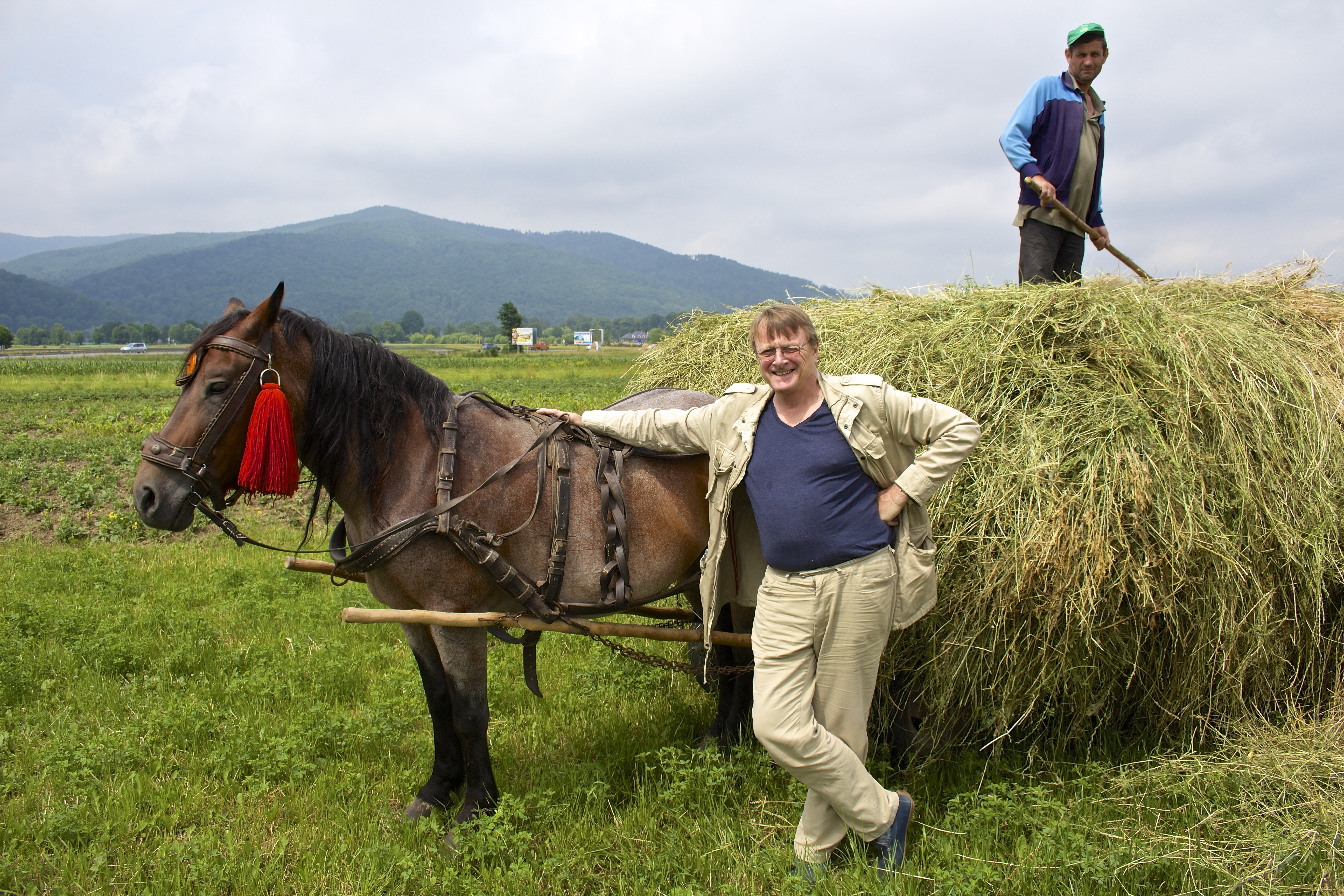 The farmers are currently mowing their hay, standing it in stooks and bringing it in on the horse-darwn carts. Some of them are old and unchanged, some young, wearing trainers and chatting on their mobile phones while driving their cart through the traffic.
