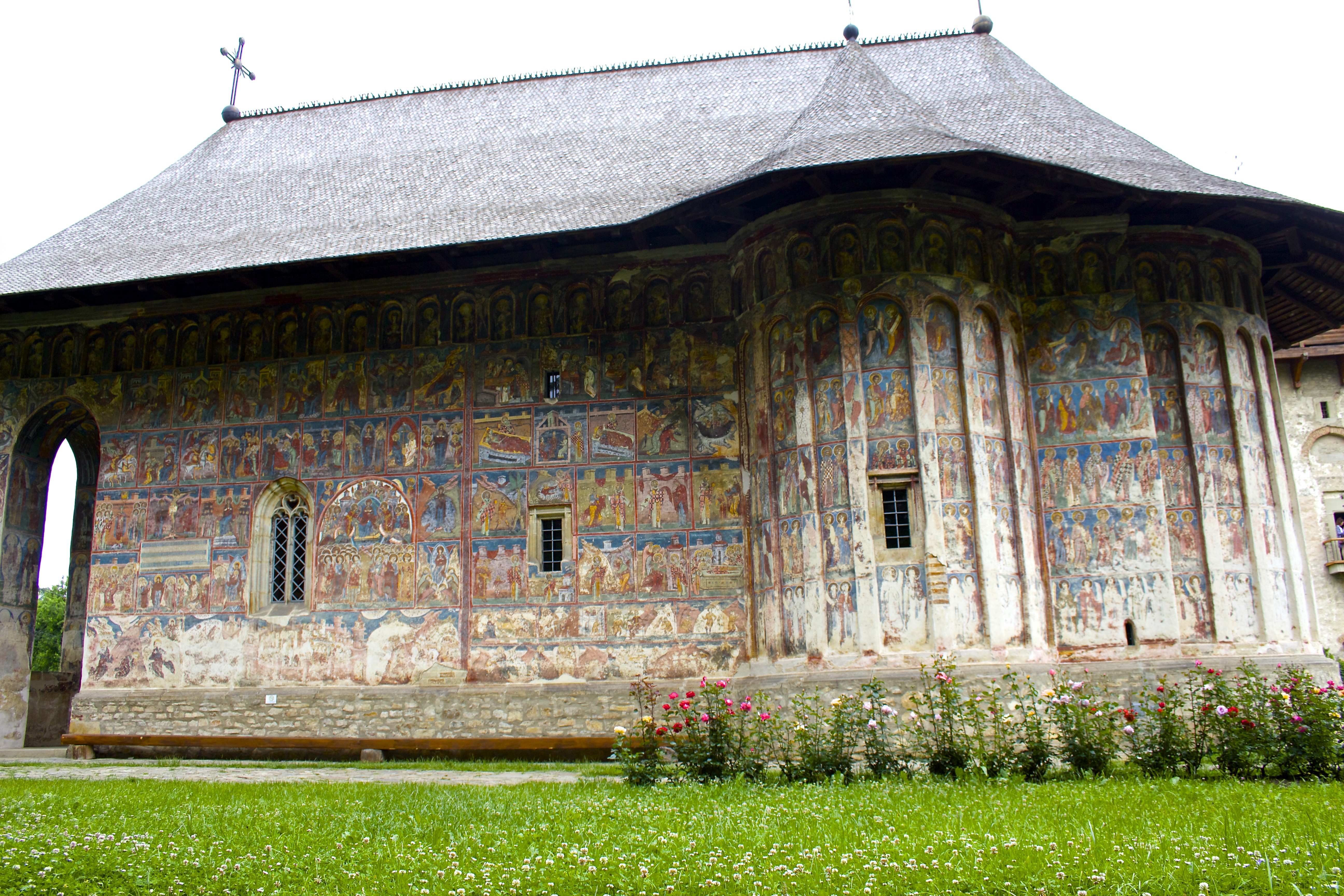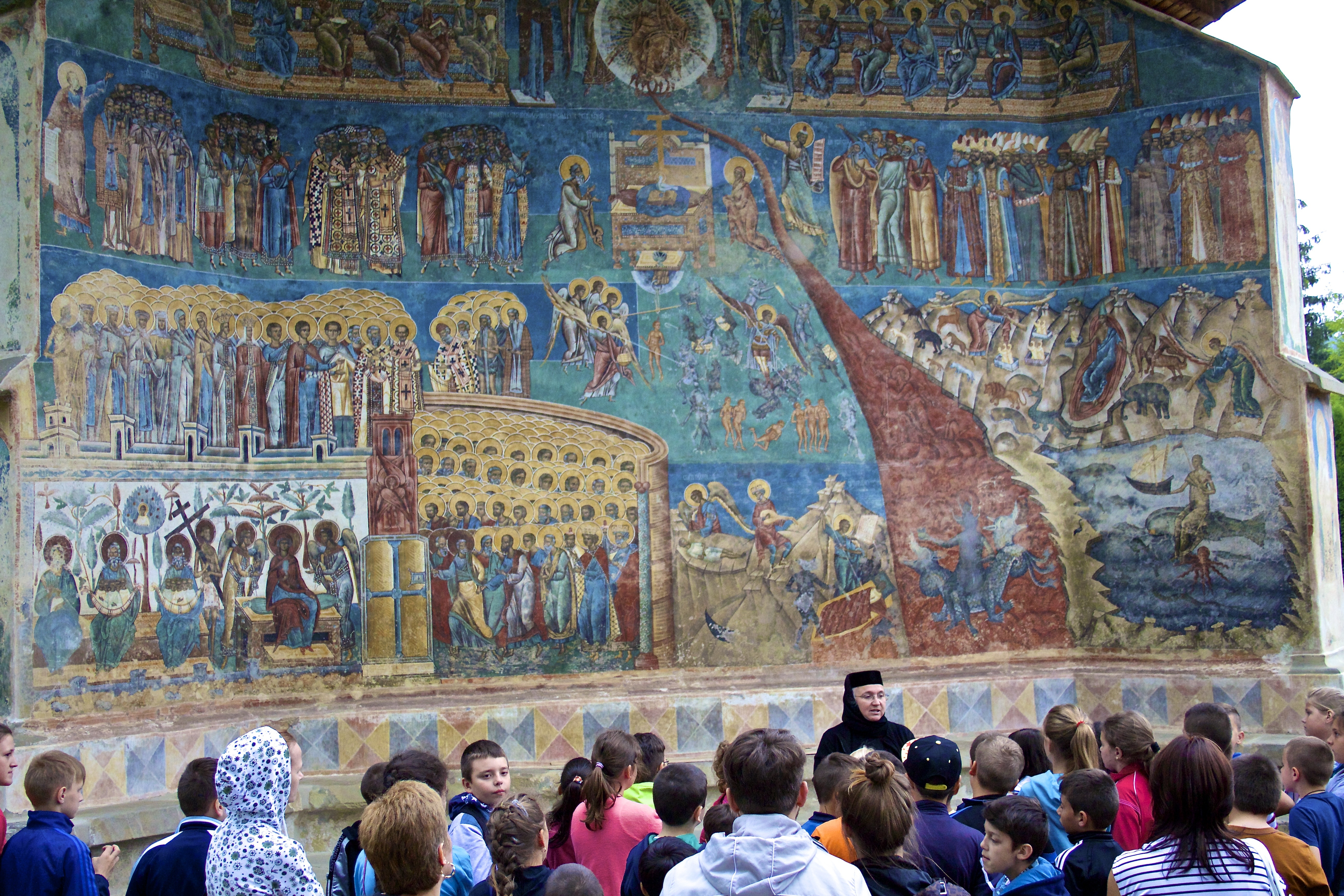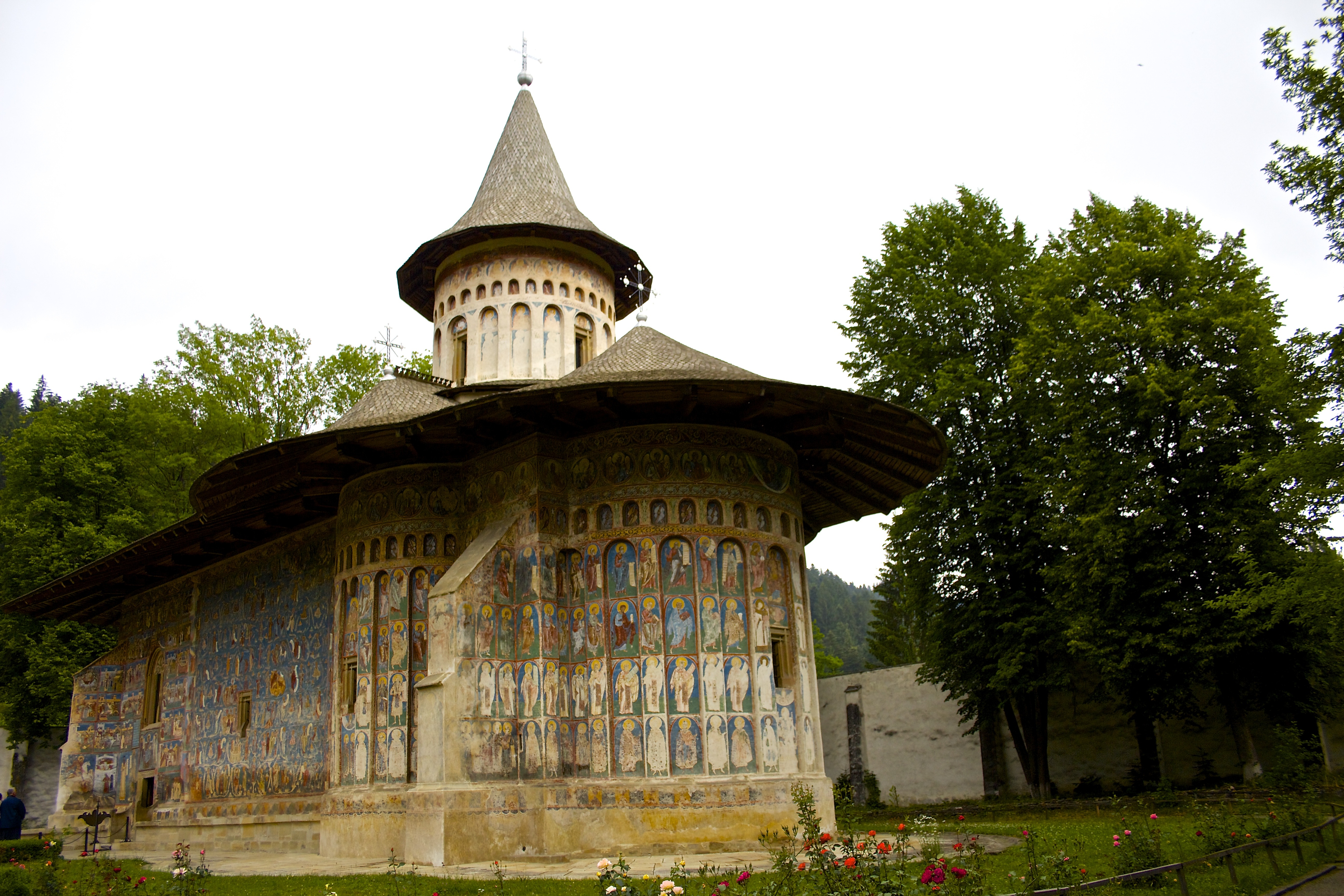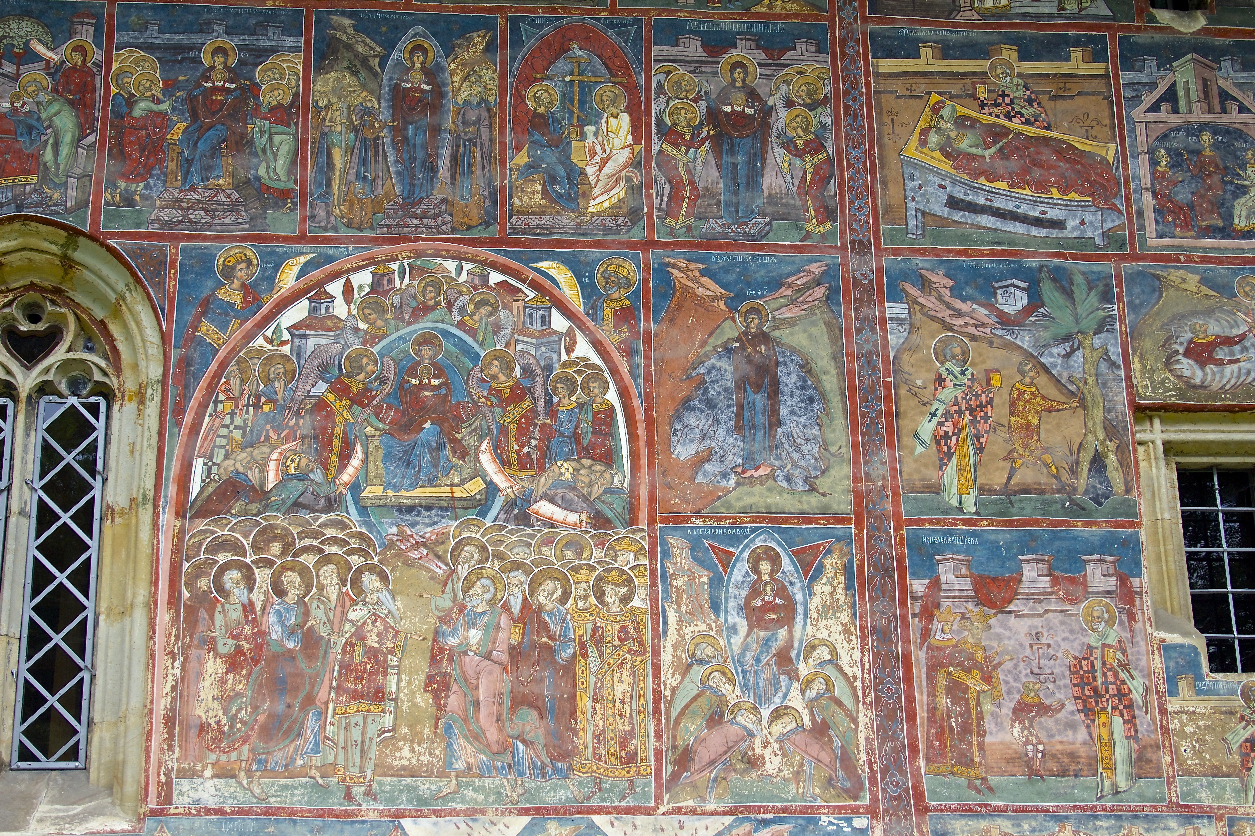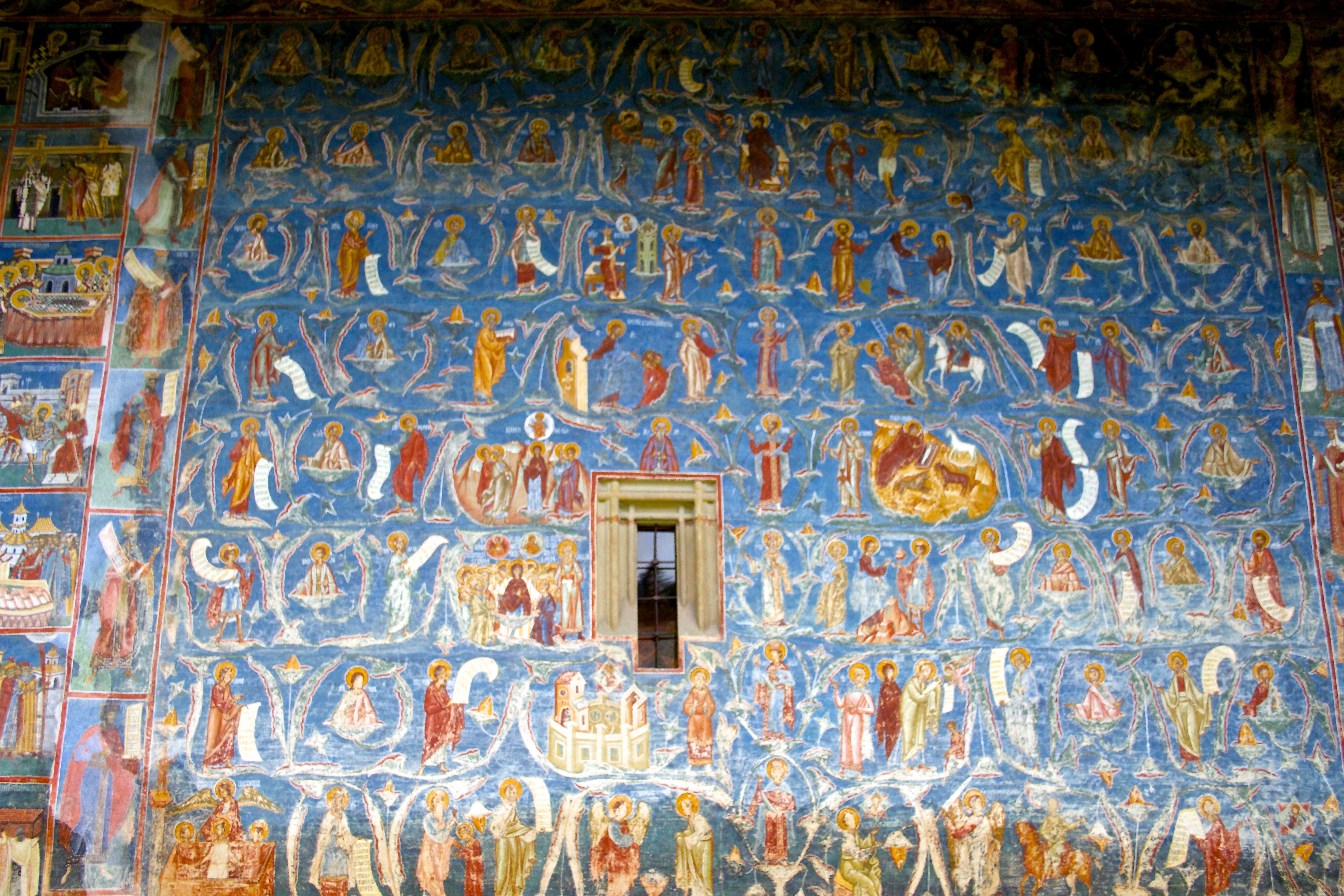 Voronet’s southern wall depicts the Tree of Jesse, and also features the dominant colour blue, which particular tone is known as Voronet blue. Each of the key painted monasteries has a dominant colour theme, thus Humor, which I visited earlier today, favours red and brown.