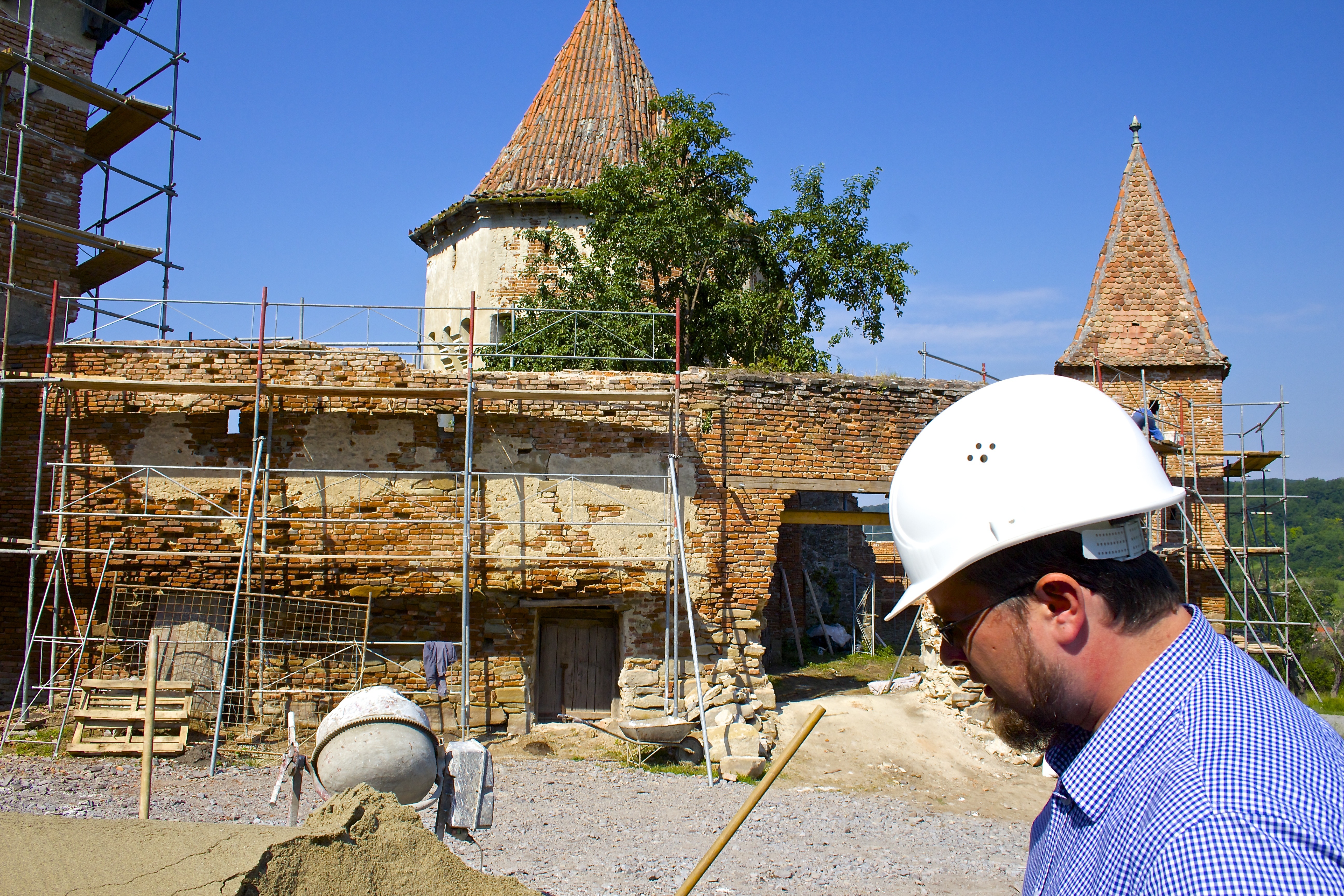 Up a small side valley was the little village of Alma Vii, whose 14th century hilltop church and its 16th century fortifications are being extensively restored, again with EU funding. I spoke with the conservator in charge, Soltan, who explained their use of traditional materials and the difficulty of sourcing the right kind of bricks. His attitude and principles seemed very much in line with a friend of mine who does a lot of Britain’s historic conservation work. Soltan is on a tight schedule to have the work completed by next March, or face financial penalties. He agreed there is a lot of such work in progress now, a great improvement on the anarchy he said prevailed after the revolution, instancing one ruined antiquity whose stones had all been removed by locals for their own building projects. He was not the first to volunteer support for the Prince’s initiatives in the area.