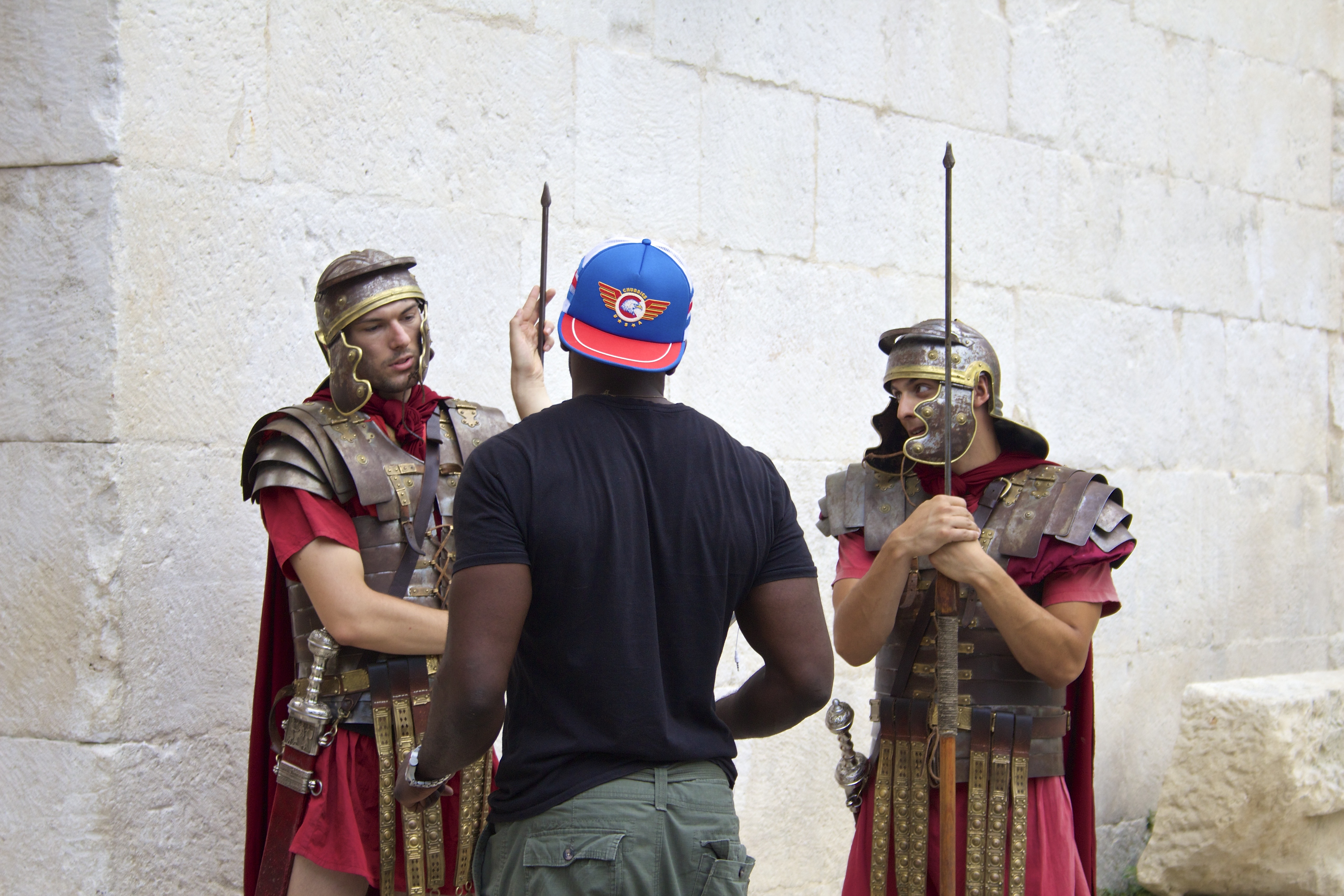 Ours were by a rather good restaurant in the walls, archly called Diocletian’s Wine House, with a sunken courtyard festooned with newly imported ancient olive trees, which we had to ourselves, along with fresh fish and an excellent bottle of local wine. The local waiter was both knowledgable and proud regarding the wine. The locals have a whole range of jobs dependent upon the tourist income, including those who dress as centurions and one old bugger who unaccountably turns out as a summer Santa.
