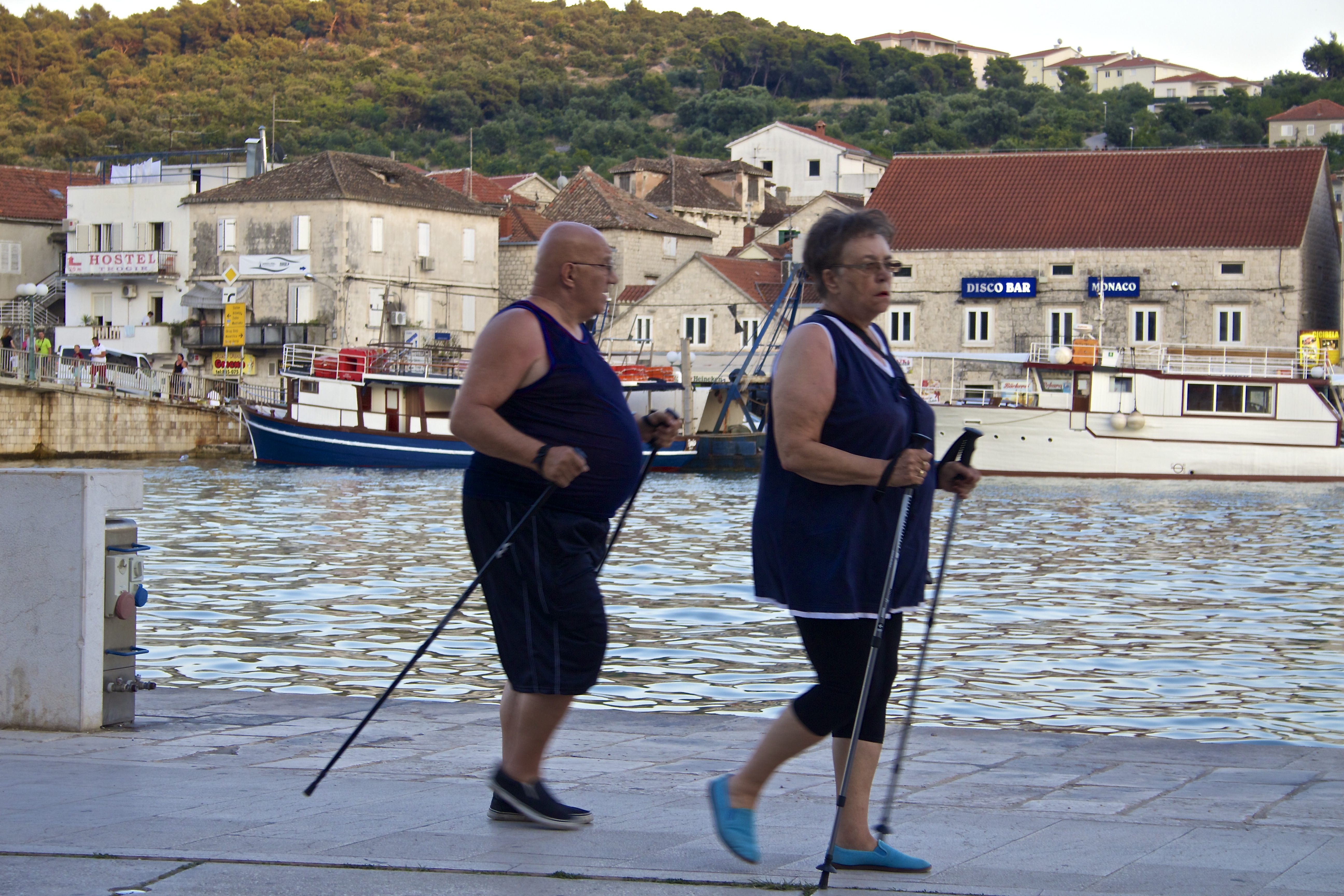 Later, I spotted this old lady with her arm in a sling methodically touring the Split bins to retrieve plastic bottles, presumably for some recycling income. And then there was this well ballasted pair deploying walking poles on the essentially flat quay of Trogir.